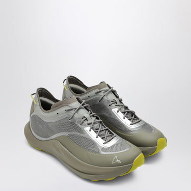 Low Roa sneaker with a silver and khaki green synthetic fabric upper, characterized by lace-up closure, rear loop, logo details, and acid yellow rubber sole.