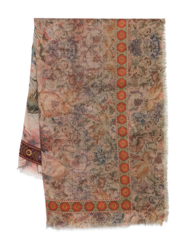 blue/multicolour cashmere fine knit floral print frayed edge wraparound style Printed cashmere scarf Size and Fit - LENGTH: 195.0 Centimetres. WIDTH: 135.0 Centimetres.