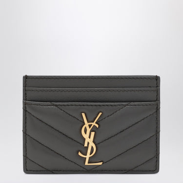Grey leather card holder by Saint Laurent, featuring quilted design, Cassandre metal logo on the front, and five card slots. Size and Fit - Width 10,5 cm x Height 7,5 cm x Depth 0,5 cm Handle drop: 30 cm