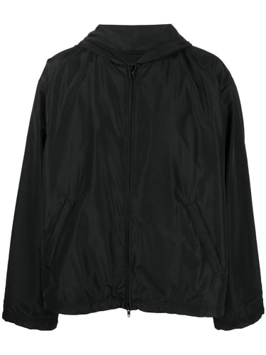 logo-print hooded windbreaker from BALENCIAGA featuring black/white, lightweight construction, logo print to the rear, classic hood, front two-way zip fastening, drop shoulder, long wide sleeves, drawstring cuffs, internal zip-fastening pockets, two side zip-fastening pockets, drawstring hem and mesh lining. Nylon zipped jacket Size and Fit - This piece fits true to size. We recommend you get your regular size. Model is 1,75m / 5ft 8in wearing size 1 (NUM)