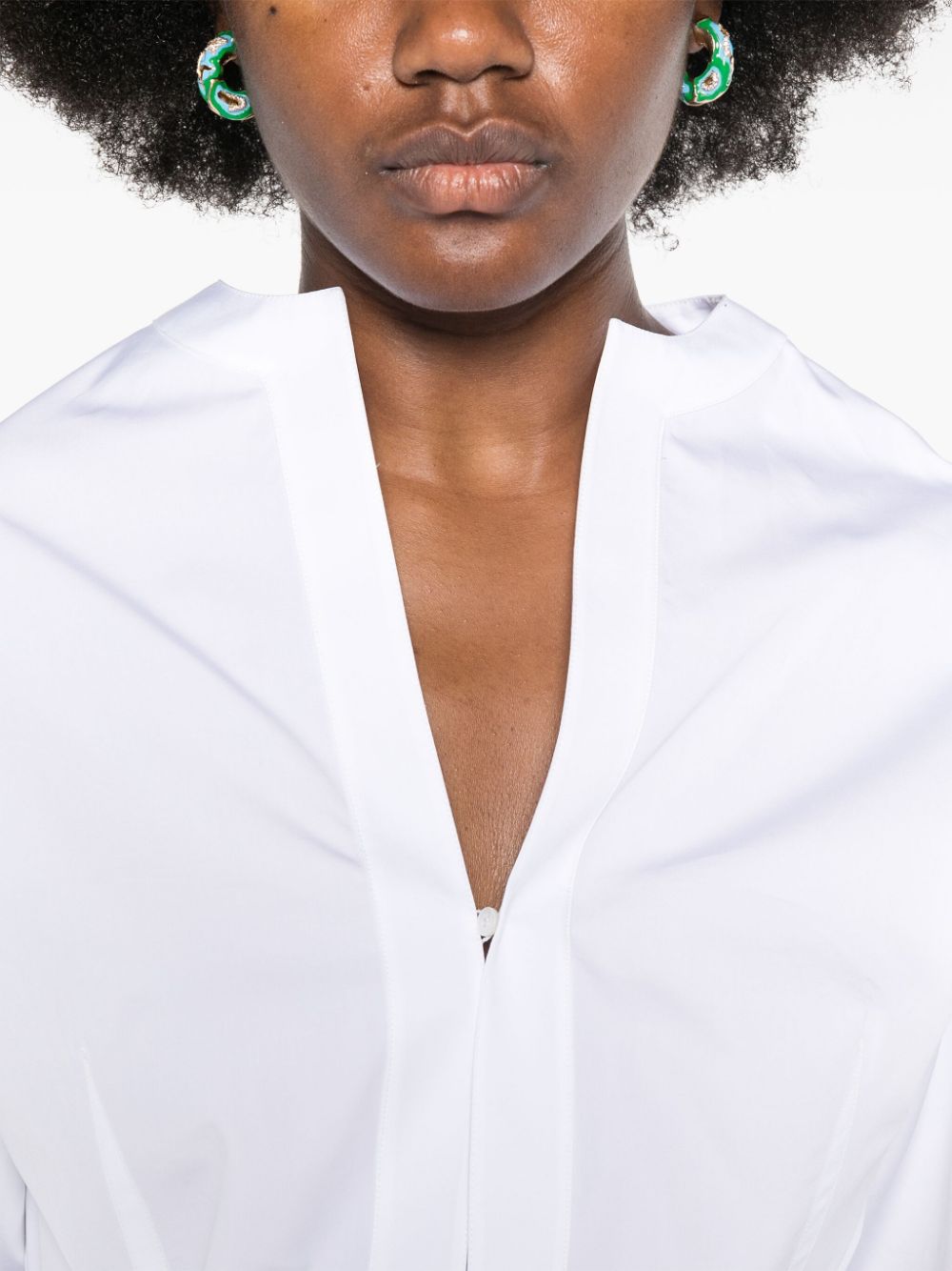 White cotton poplin shirt-bodysuit with ribbed trims, V-neckline, front button fastening, dropped shoulders, and long sleeves with buttoned cuffs. High-cut leg and unlined construction for a sleek, smooth fit—an elevated base layer for FW24 – Autumn/Winter 2024.