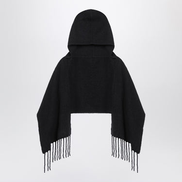 Black wool and cashmere cape by Destin Surl, featuring hood and fringed edges.