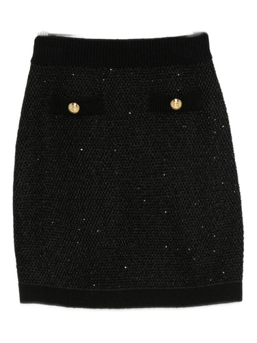 black button embellishment ribbed waistband straight hemline Wool knitted skirt