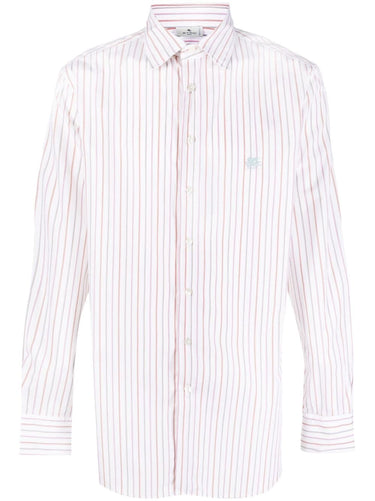 logo-embroidered striped shirt from ETRO featuring sand beige, multicolour, cotton, embroidered logo at the chest, vertical stripe pattern, spread collar, front button fastening, long sleeves, buttoned-cuff sleeves and curved hem. Striped cotton shirt Size and Fit - This piece fits true to size. We recommend you get your regular size. Model is 1,84m / 6ft 1in wearing size 39 (COLLAR CM)