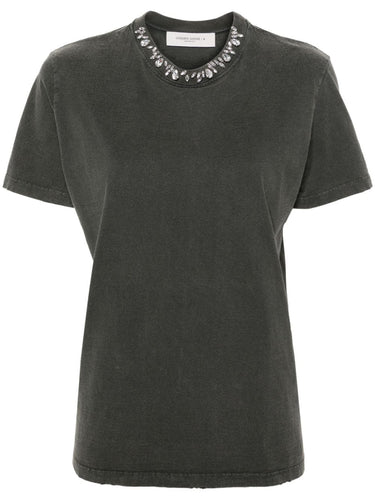 anthracite grey cotton lightweight jersey distressed finish crystal embellishment silver-tone logo plaque round neck short sleeves straight hem Embroidered cotton t-shirt