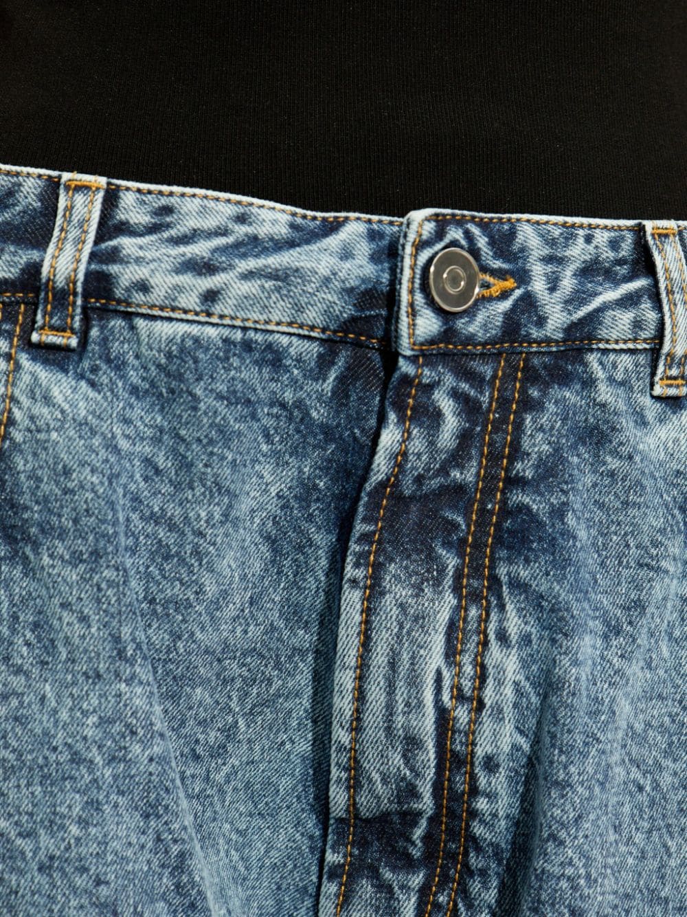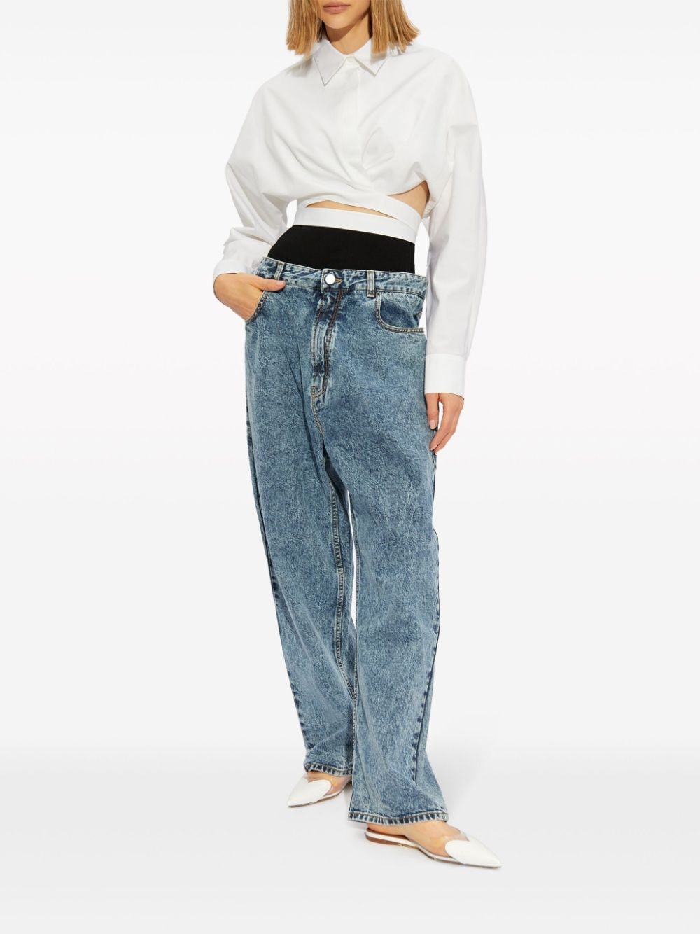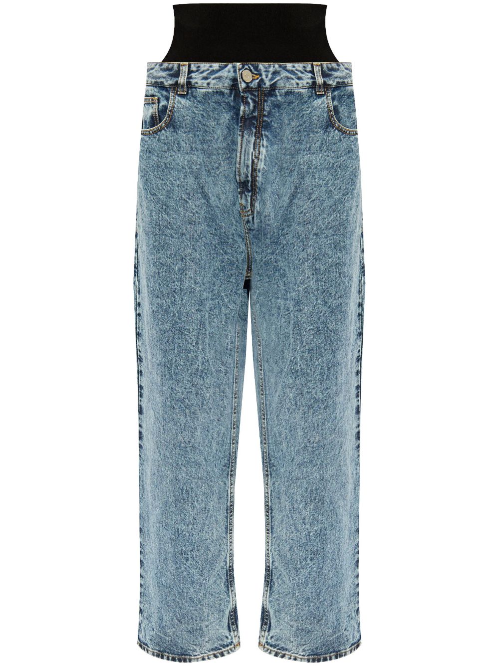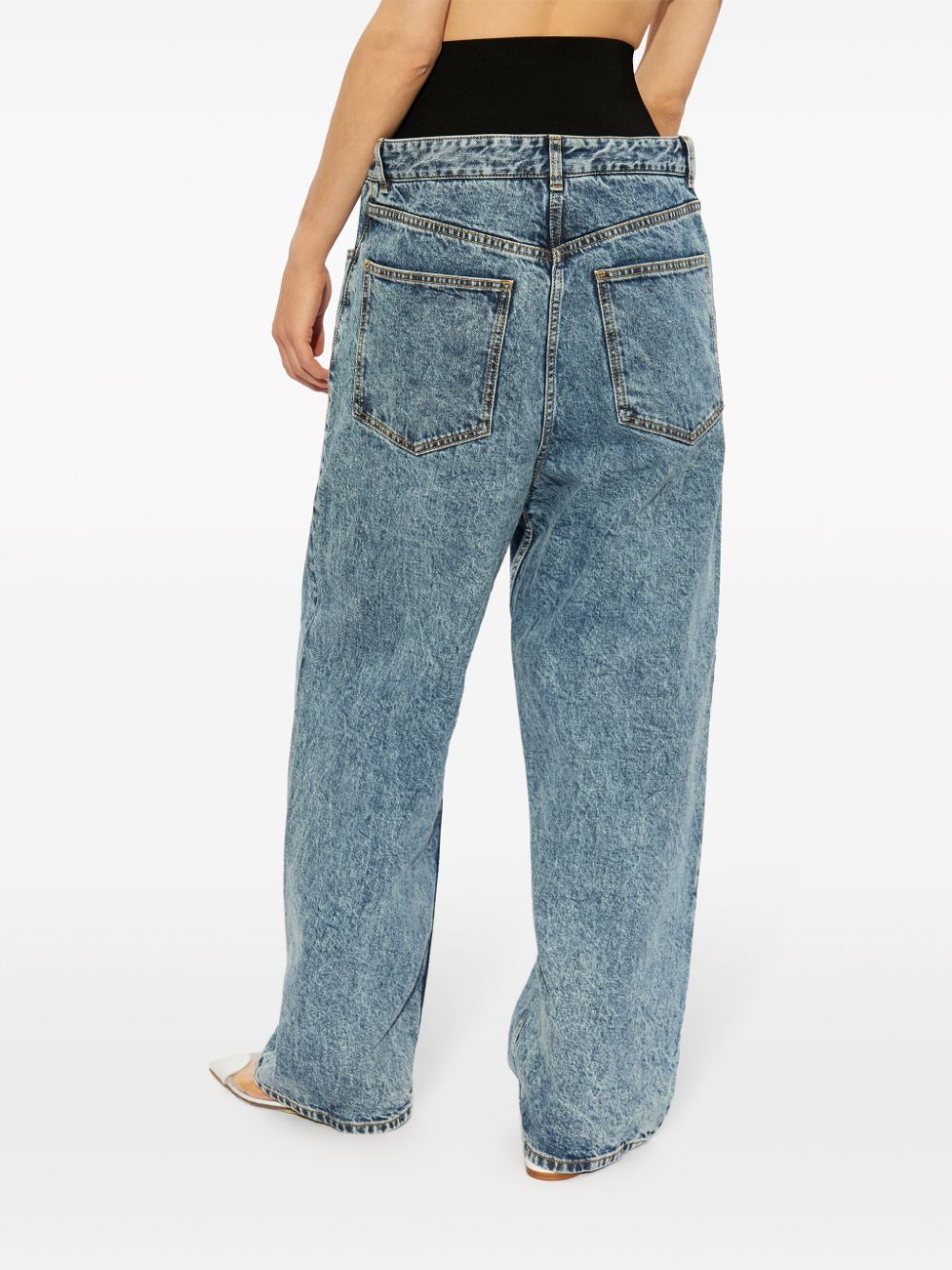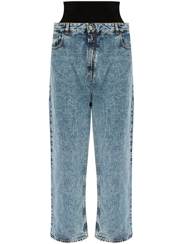 Blue cotton-blend denim jeans with a sky-high rise and straight leg. Designed with a comfortable elastic waistband, classic five-pocket construction, contrast topstitching, and an oversized framed look—refined everyday denim for FW24 – Autumn/Winter 2024.