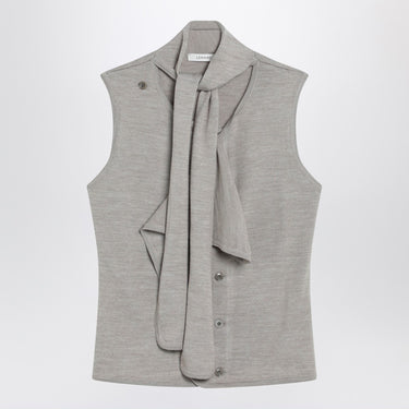 Lemaire light taupe wool-blend vest, featuring asymmetric design with neck tie scarf, button closure, and ribbed trims. Size and Fit - Model wears size S Model measurements: Height: 182 cm Chest: 79 cm Waist: 62 cm Hips: 90 cm
