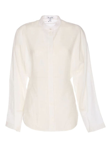 White linen-blend shirt with a refined curved silhouette and long sleeves. Crisp yet breathable fabric for polished everyday styling—an elevated essential for FW25 – Autumn/Winter 2025.