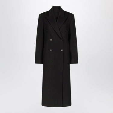 Double-breasted coat by LouLou de Saison in black wool and cashmere, featuring a lance collar, two side pockets, long sleeves with buttoned cuffs, front buttoning, and a back vent. Size and Fit - Model wears size 36 FR Model measurements: Height: 178 cm Chest: 83 cm Waist: 63 cm Hips: 91 cm