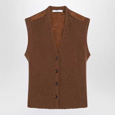 Vest by Max Mara in brown wool-cashmere yarn, featuring ribbed front, asymmetric hem shorter at the back, slim fit, V-neckline, front button closure, Monogram jacquard satin insert at back, and back waist strap with metal buckle. Size and Fit - Model wears size S Model measurements: Height: 182 cm Chest: 79 cm Waist: 62 cm Hips: 90 cm
