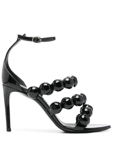 Black patent-leather high-heel sandal with three slim straps, an ankle strap with buckle, and domed decorative details. Features a square open toe, branded leather insole, and a leather-and-rubber sole—elegant and striking for FW24 – Autumn/Winter 2024.
