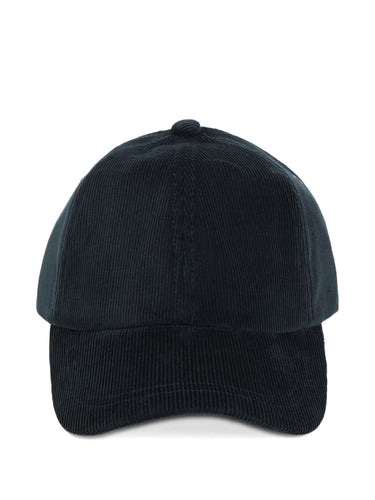 dark blue adjustable strap to the rear curved brim fabric-covered button at the crown panelled design Signature Stripe baseball cap
