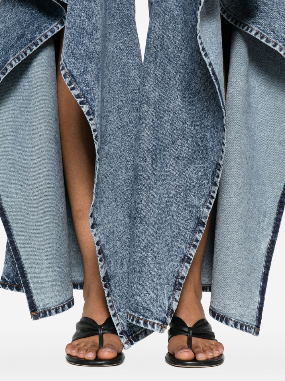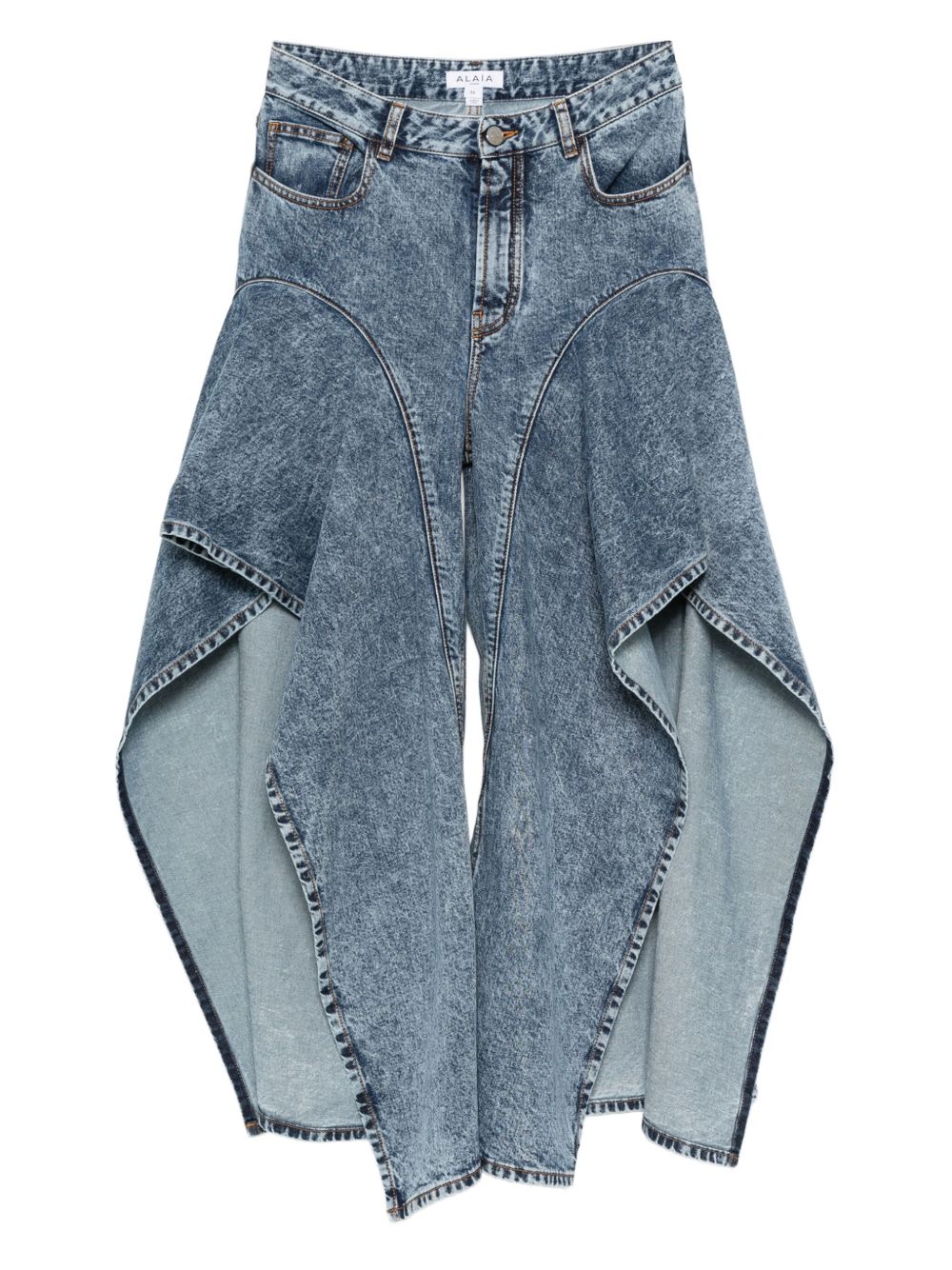 Blue denim jeans with sculptural ruffle detailing for a distinctive Alaïa silhouette. Clean lines and refined construction elevate everyday styling—a statement denim piece for FW25 – Autumn/Winter 2025.