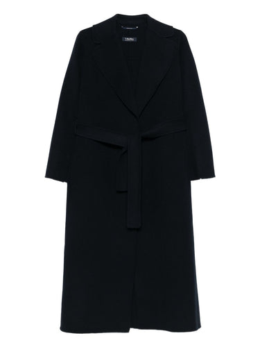 navy blue virgin wool adjustable detachable belt lapel collar long sleeves side slit pockets Wool coat