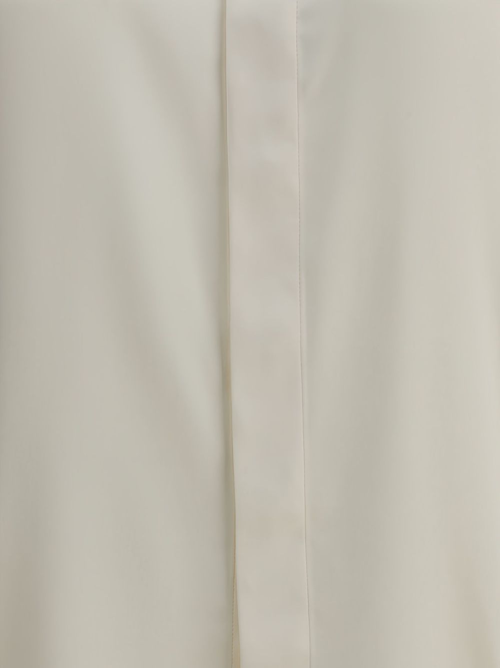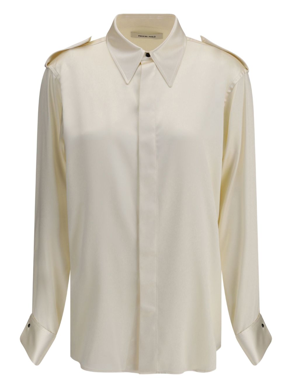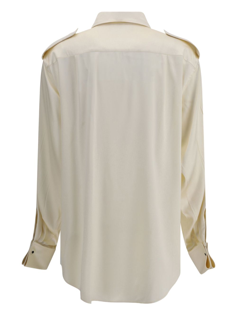 Cream silk-stretch shirt (93% silk, 7% elastane) with a refined drape and smooth handfeel. Tailored long sleeves and a clean button front deliver an elegant, minimalist silhouette for polished everyday styling—perfect for FW25 – Autumn/Winter 2025.