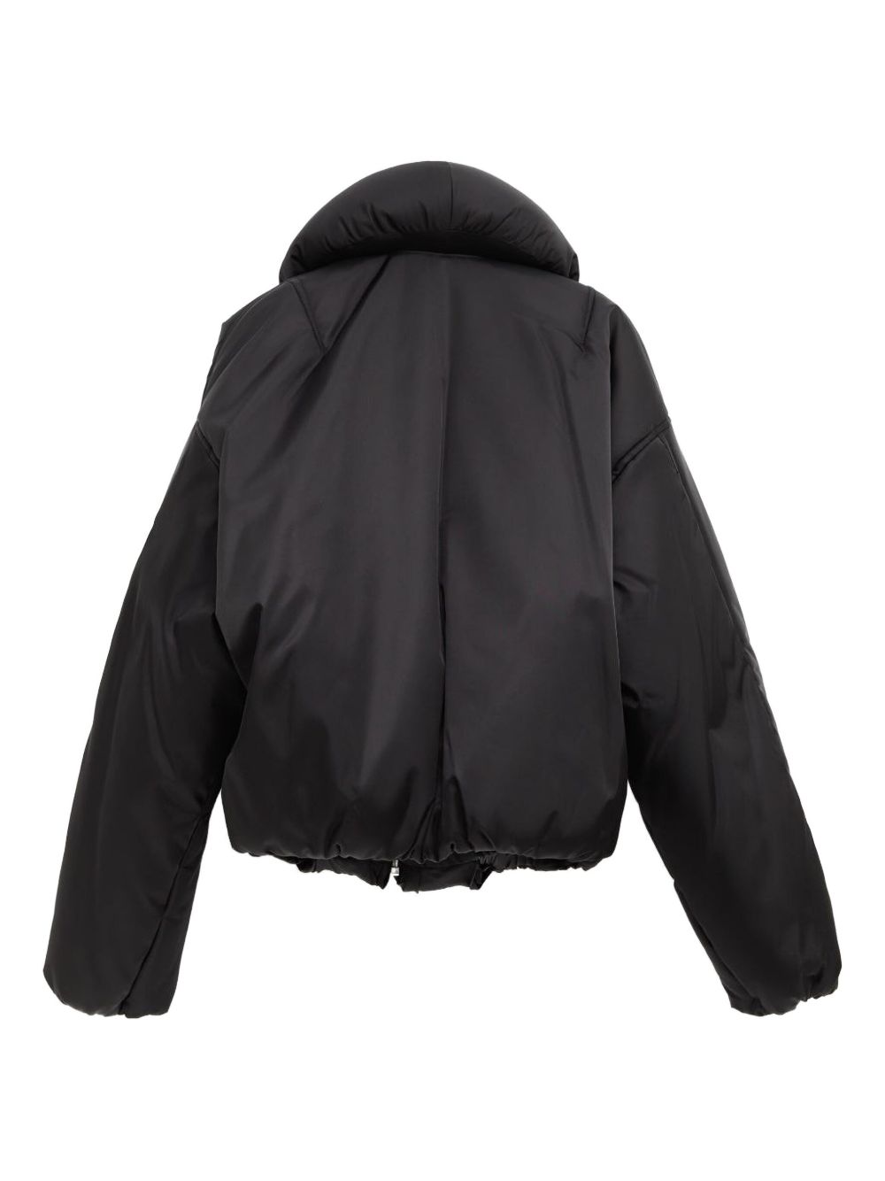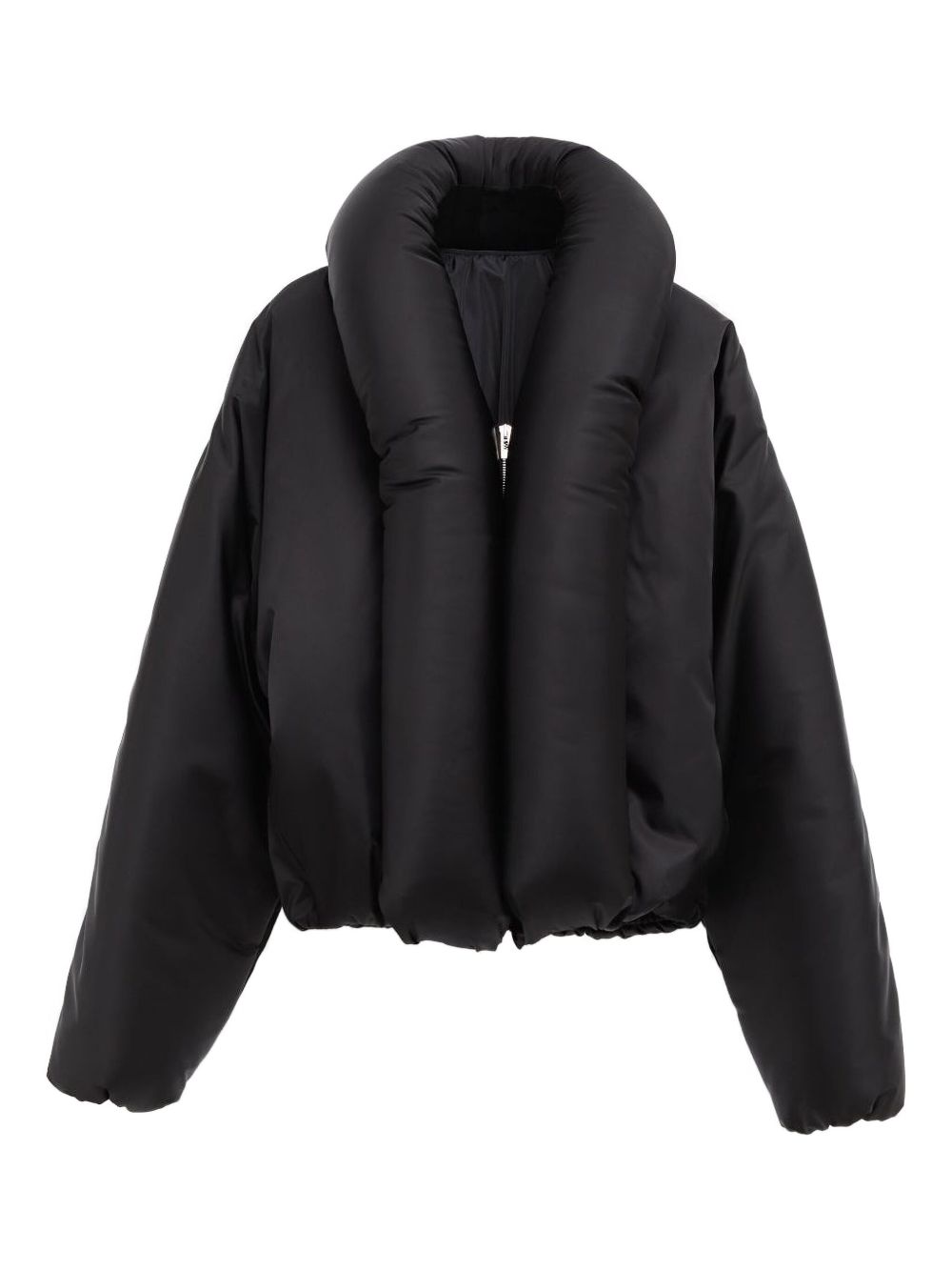 Black cropped puffer jacket in lustrous taffeta with padded profiling for structure and definition. Lightweight yet substantial, cut for a clean, sculpted silhouette—an elevated outerwear piece for FW25 – Autumn/Winter 2025.