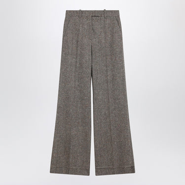 Valentino palazzo trousers in ivory and brown patterned virgin wool, featuring belt loops, front zip, button and hook closure, two side pockets, two back pockets, and pressed pleats front and back. Size and Fit - Model wears size 40 IT Model measurements: Height: 182 cm Chest: 79 cm Waist: 62 cm Hips: 90 cm