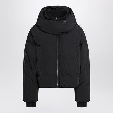 Short black down jacket in crinkled-effect water-repellent technical fabric, soft cropped volume, goose down filling, removable hood with snap buttons, high collar, front zip closure, flap side pockets, rib-knit collar and cuffs, and relaxed fit. Size and Fit - Model wears size 40 IT Model measurements: Height: 182 cm Chest: 79 cm Waist: 62 cm Hips: 90 cm