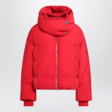 Short red down jacket in crinkled-effect water-repellent technical fabric, soft cropped volume, goose down filling, removable hood with snap buttons, high collar, front zip closure, flap side pockets, rib-knit collar and cuffs, and relaxed fit. Size and Fit - Model wears size 40 IT Model measurements: Height: 182 cm Chest: 79 cm Waist: 62 cm Hips: 90 cm