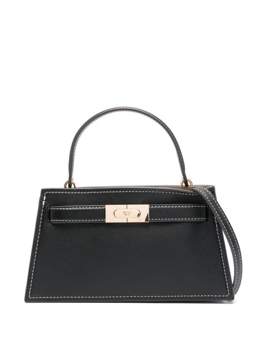 black open top single top handle adjustable detachable shoulder strap internal card slots Lee Radziwill small leather handbag Size and Fit - DEPTH: 6.0 Centimetres. HANDLE: 9.0 Centimetres. HEIGHT: 12.0 Centimetres. WIDTH: 24.0 Centimetres.