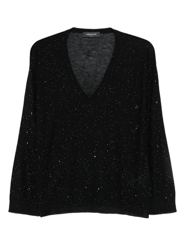 black V-neck long sleeves fine knit glitter Wool v-necked sweater Size and Fit - This piece fits true to size. We recommend you get your regular size. Model is 1,75m / 5ft 8in wearing size 40 (IT)