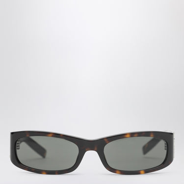 Saint Laurent sunglasses with elongated Havana tortoiseshell acetate frame, featuring Cassandre logo on the temples, nylon lenses with 100% UVA/UVB protection.