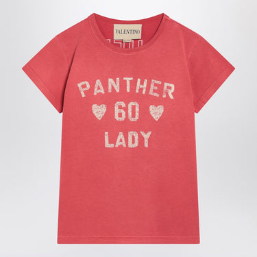 Light red vintage effect cotton T-shirt by Valentino, featuring short sleeves, ribbed crew neck, front print, and contrasting Chez Valentino embroidery on the back. Size and Fit - Model wears size S Model measurements: Height: 179 cm Chest: 82 cm Waist: 65 cm Hips: 90 cm