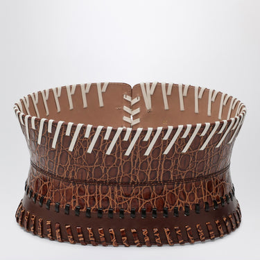 Light brown crocodile-effect leather belt by Dries Van Noten, featuring corset design, contrasting lace-up decoration on the edges, and adjustable fastening. Size and Fit - 15 cm Model wears size 85 EU Model measurements: Height: 179 cm Chest: 82 cm Waist: 65 cm Hips: 90 cm