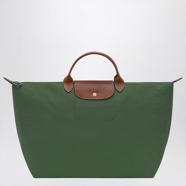 Small bag by Longchamp made of green recycled polyamide canvas with brown leather details, featuring two top handles, book closure with magnetic clasp, zip fastening and main compartment. Size and Fit - Width 24 cm x Height 17 cm x Depth 11,5 cm Adjustable shoulder strap length min 50 cm - max 100 cm Handle drop: 10 cm