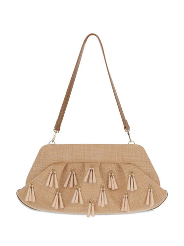 sand beige magnetic fastening single detachable top handle bead embellishment main compartment Emera fringed clutch Size and Fit - Width: 31cm, Height: 18cm, Depth: 7cm