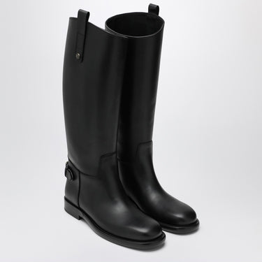 Burberry knee-high boots in smooth black calfskin, featuring tall shaft, round toe, tab details, buckle straps at the ankle and leather and rubber sole.