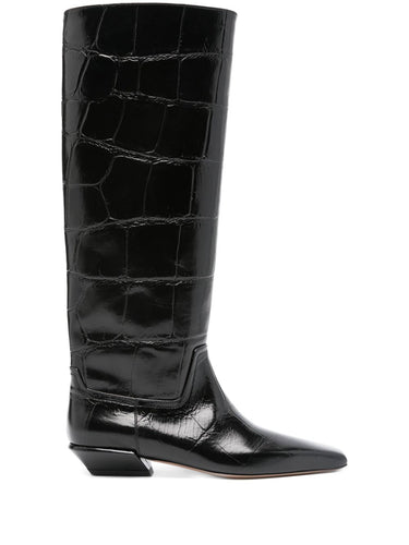 black calf leather embossed crocodile effect square toe low block heel leather and rubber sole Bettina leather boots Size and Fit - Heel 3 cm