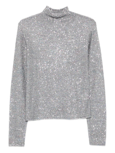 silver-tone, mock neck, long sleeves, sequin embellishment, fine knit. Turtle-neck sweater