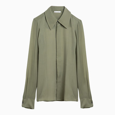 Olive green silk shirt by Ami Paris featuring a wide pointed collar, long sleeves with buttoned cuffs and a concealed front button fastening. Size and Fit - Model wears size 36 FR Model measurements: Height: 179 cm Chest: 82 cm Waist: 65 cm Hips: 90 cm