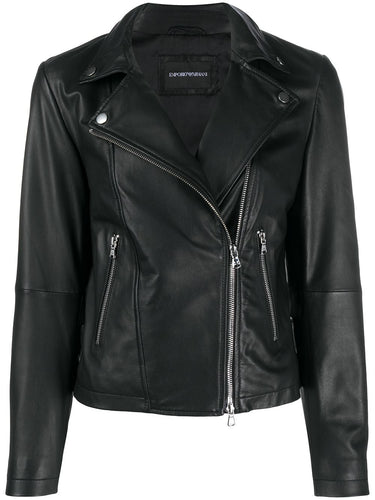 Black leather zipped biker jacket from Emporio Armani featuring an off-centre front zip fastening, zipped side pockets, rivet detailing, panelled long sleeves and zipped cuffs. Leather jacket