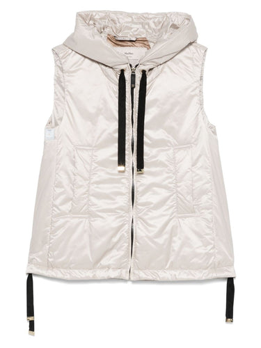 light beige front zip fastening two side welt pockets slouchy drawstring hood drawstring hem Nylon down vest