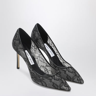 Pumps by Jimmy Choo in black lace, featuring pointed design, leather lining, high stiletto heel and leather sole. Size and Fit - Heel 8,5 cm