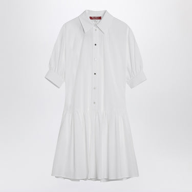 Max Mara Studio shirt dress in white cotton, characterized by a classic collar, front buttoning, short balloon sleeves with a button, a flounce at the bottom, and side welt pockets. Size and Fit - Model wears size 40 IT Model measurements: Height: 178 cm Chest: 89 cm Waist: 62 cm Hips: 88 cm