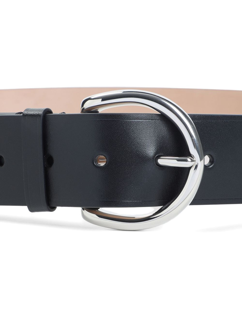 Black calf-leather belt with a silver-tone round buckle and nubuck backing. The 40 mm width is designed to be worn at the waist or hips—clean, minimal, and refined.