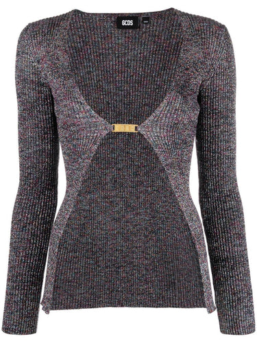 glittered V-neck cardigan from GCDS featuring dark grey, knitted construction, glitter detailing, V-neck, clasp fastening, long sleeves and straight hem. Logo lurex cardigan Size and Fit - This piece fits true to size. We recommend you get your regular size. Model is 1,75m / 5ft 8in wearing size S