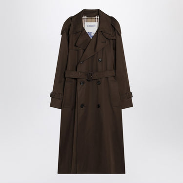 Long double-breasted trench coat by Burberry in juniper-coloured cotton gabardine, featuring long sleeves, front buttoning, a waist belt with a B-shaped buckle, epaulettes, a Check-patterned lining, a back vent, and cuffs with straps. Size and Fit - Model wears size 8 UK Model measurements: Height: 179 cm Chest: 82 cm Waist: 65 cm Hips: 90 cm