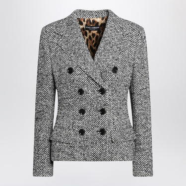 Dolce & Gabbana jacket in grey and black mixed wool with a dotted pattern, featuring wide lapels, double-breasted front fastening, two flap pockets at the front, and long sleeves with buttoned cuffs. Size and Fit - Model wears size 42 IT Model measurements: Height: 178 cm Chest: 83 cm Waist: 63 cm Hips: 91 cm