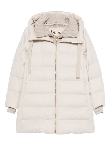 ecru quilted design hooded neckline ribbed cuffs front zip fastening long sleeves Midi down jacket
