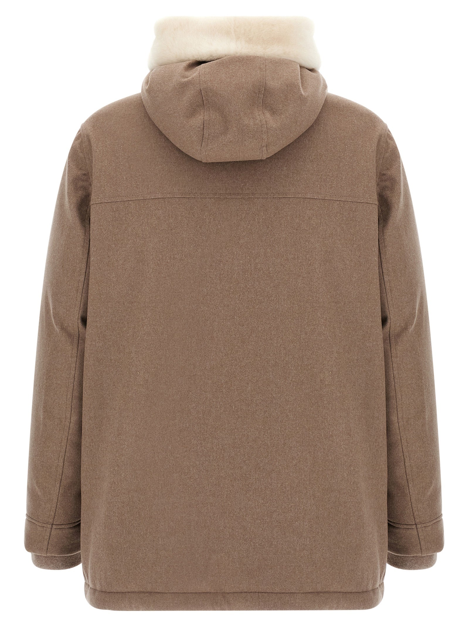 Padded and quilted membrane wool flannel down jacket, shearling-lined high neck, 4-pocket parka style, front zip closure, long sleeves with knitted cuffs. Size and Fit - True to size fit