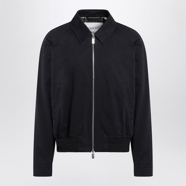 Burberry navy blue cotton jacket, featuring a shirt collar, front closure with visible double zip, long sleeves with buttoned cuffs, two side welt pockets, and ribbed knit trim with tone-on-tone embroidered logo lettering. Size and Fit - Model wears size 48 IT Model measurements: Height: 187 cm Chest: 102 cm Waist: 76 cm Hips: 92 cm
