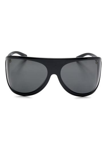 Women’s glossy black sunglasses in 100% acetate featuring integrated side shields for added coverage, UV-protective tinted lenses, and logo-detailed temples with straight arms and curved tips for a secure, comfortable fit. A refined, modern silhouette designed for everyday sun protection and polished style.