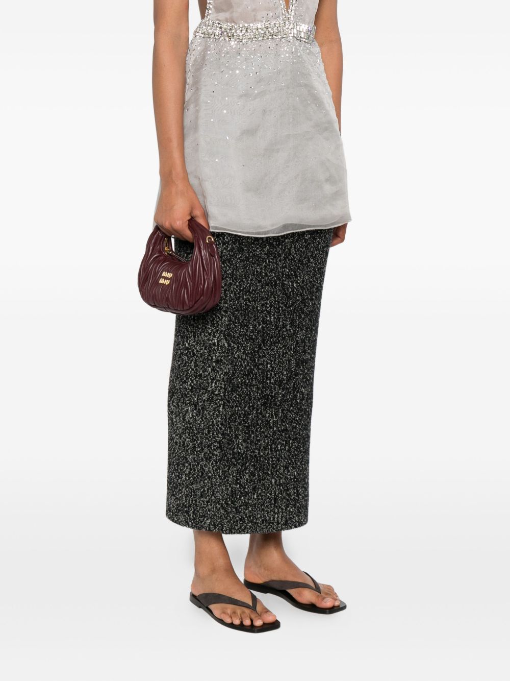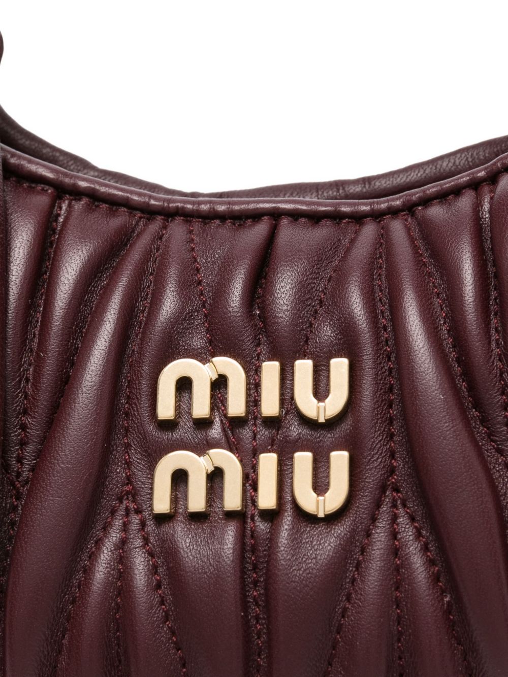 Iconica borsa Wander in versione mini, realizzata in pelle matelassé bordeaux. Design hobo compatto ma distintivo, con linee morbide e dettagli ricercati che riflettono l’eleganza contemporanea Miu Miu. Un accessorio versatile che arricchisce con stile la stagione FW25 – Autunno/Inverno 2025.