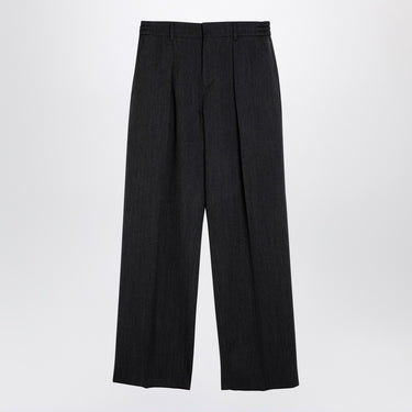 Dark grey wool Burberry trousers featuring a front zip and hook fastening, belt loops, an elasticated waistband, two side welt pockets and a back welt pocket. Size and Fit - Model wears size 48 IT Model measurements: Height: 187 cm Chest: 102 cm Waist: 76 cm Hips: 92 cm