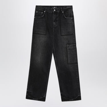 Represent jeans in black cotton denim with a faded effect, characterized by a front closure with zip and button, belt loops including one with a logo plate, five classic pockets, a sewn logo on the back pocket, and a welt pocket on the side. Size and Fit - Model wears size 32 Model measurements: Height: 185 cm Chest: 105 cm Waist: 85 cm Hips: 100 cm