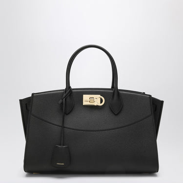 Large Ferragamo handbag in black calfskin, characterized by side pleats, closure with Gancini slider buckle, double internal compartment, adjustable and removable shoulder strap, gold metal hardware, removable logo keychain, and double top handle. Size and Fit - Width 36 cm x Height 24 cm x Depth 16,5 cm Shoulder strap lenght 74 cm Handle drop: 15 cm
